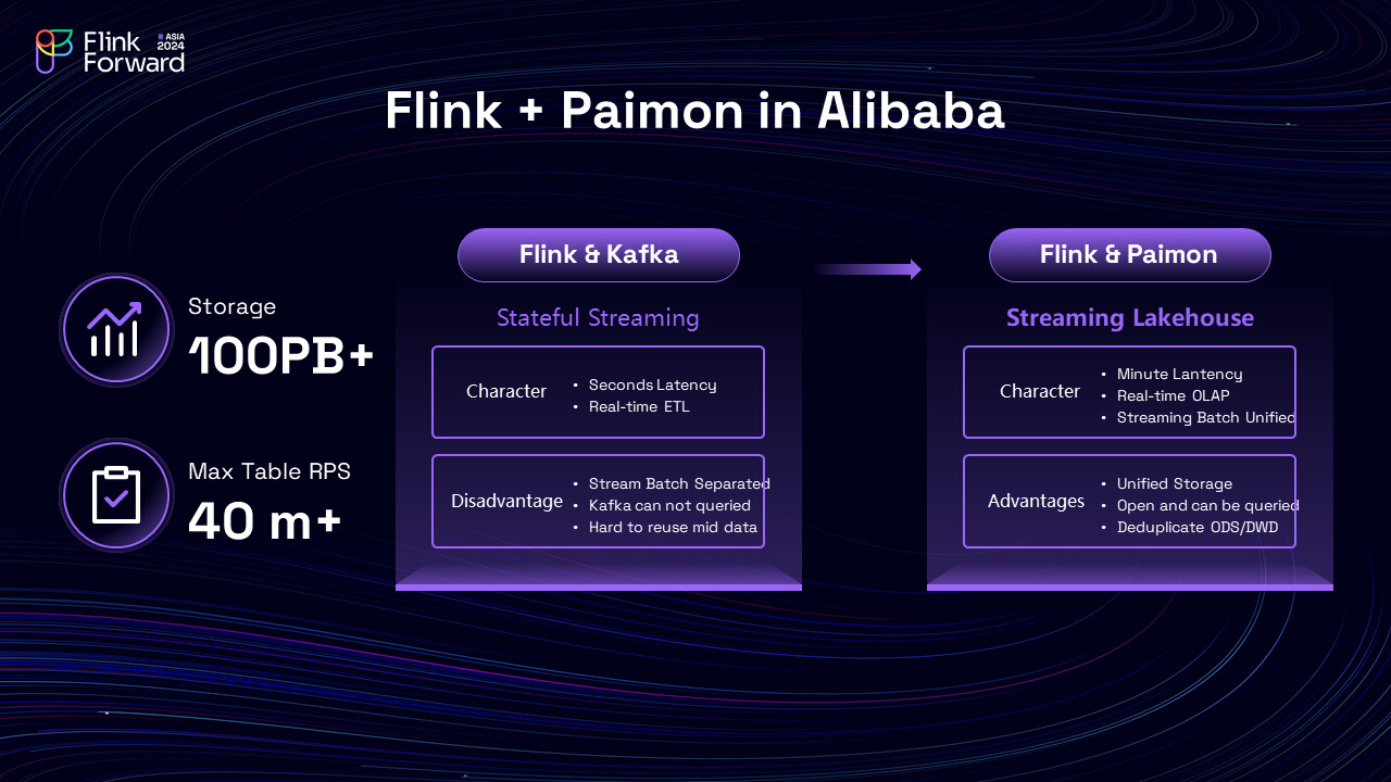 With all these advantages, Paimon has gained significant traction in the Chinese community, with over ten thousand Flink streaming jobs in one company and numerous enterprise adoptions. For example at Alibaba, large tables, such as page views and orders, have been moved to Paimon. There are now over 100PBs of Paimon data files residing in its storage cluster, and among them the largest Paimon table supports a processing rate of more than 40 million rows per second.