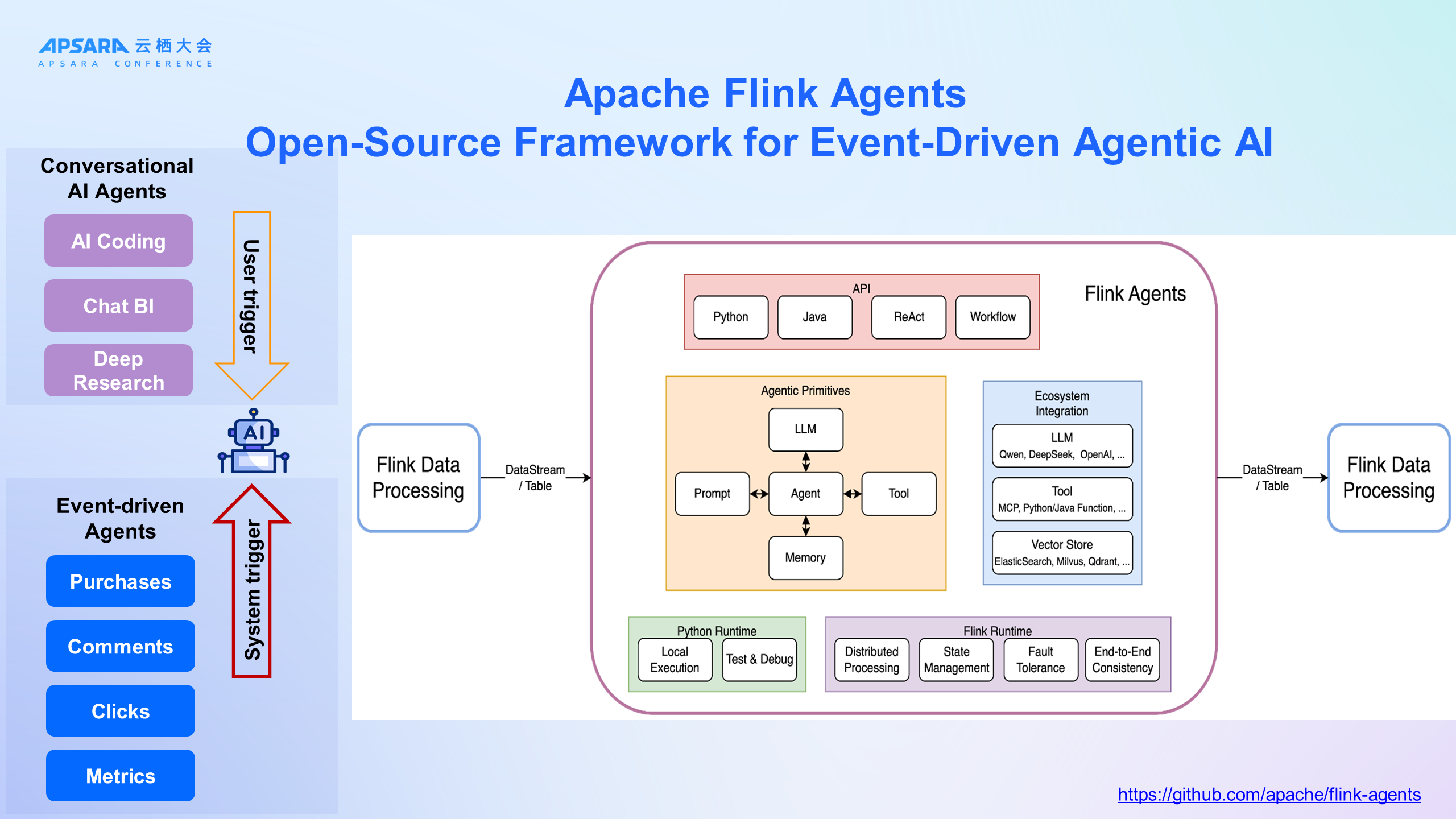 Apache Flink Agents, a new sub‑project in the Apache Flink community initiated by Alibaba Cloud and others, is an open‑source framework for building event‑driven agents. It supports event‑driven AI agents, Chat BI, deep research, and both conversational and reactive AI.