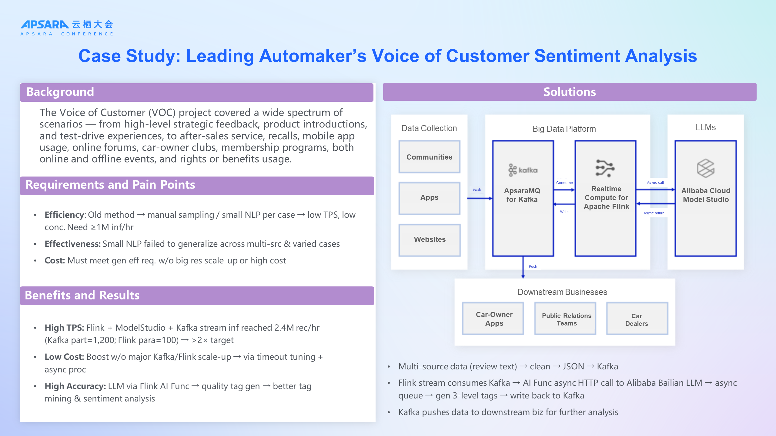 In a real‑time Voice of Customer (VOC) analysis project for a top automobile manufacturer, the application covered a wide spectrum of scenarios — from high‑level strategic feedback, product introductions, and test‑drive experiences, to after‑sales service, recalls, mobile app usage, online forums, car‑owner clubs, membership programs, both online and offline events, and rights or benefits usage.