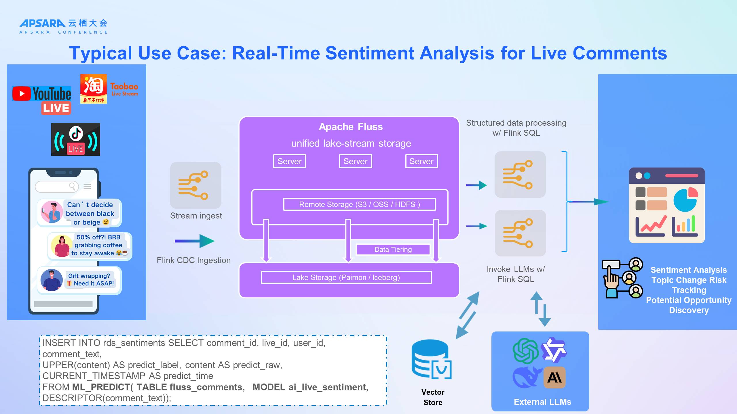 Consider the typical application of real‑time sentiment analysis on live‑stream comments. By using Flink SQL to invoke LLMs—integrated with external LLMs services and the Apache Fluss (incubating) unified lake‑stream storage—you can perform a wide range of advanced analyses, including: