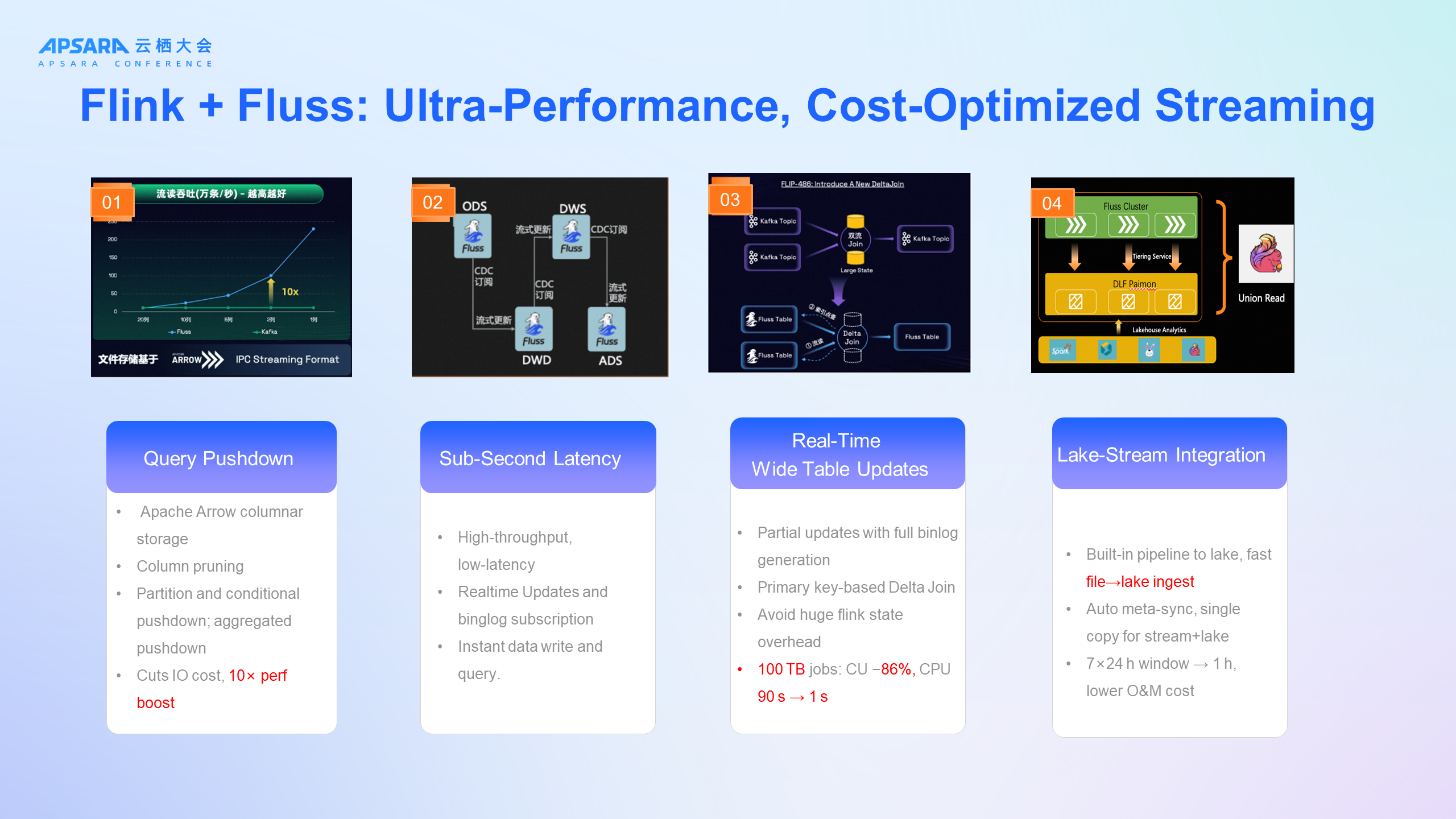 Combined with Flink, Fluss delivers high-performance, low-cost stream processing. Delta join capabilities eliminate large-state burdens, dramatically reducing CU consumption (e.g., one Taobao group case cut 100TB+ state jobs by 86% CU reduction, latency from 90s to 1s).