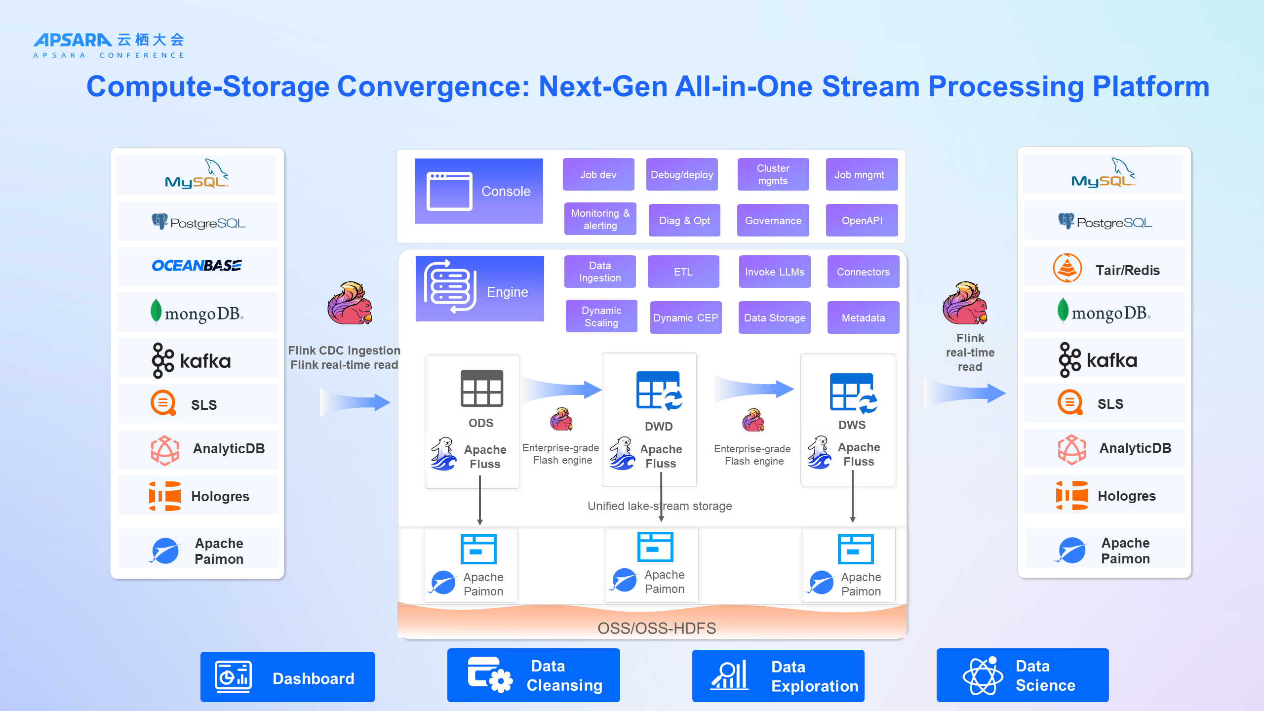 On top sits the job development and operations platform — the Console — offering end-to-end management: from resource allocation and job lifecycle management, to APIs, observability features, performance tuning, and diagnostics. Data source connectors and output destinations form a rich ecosystem around the platform.