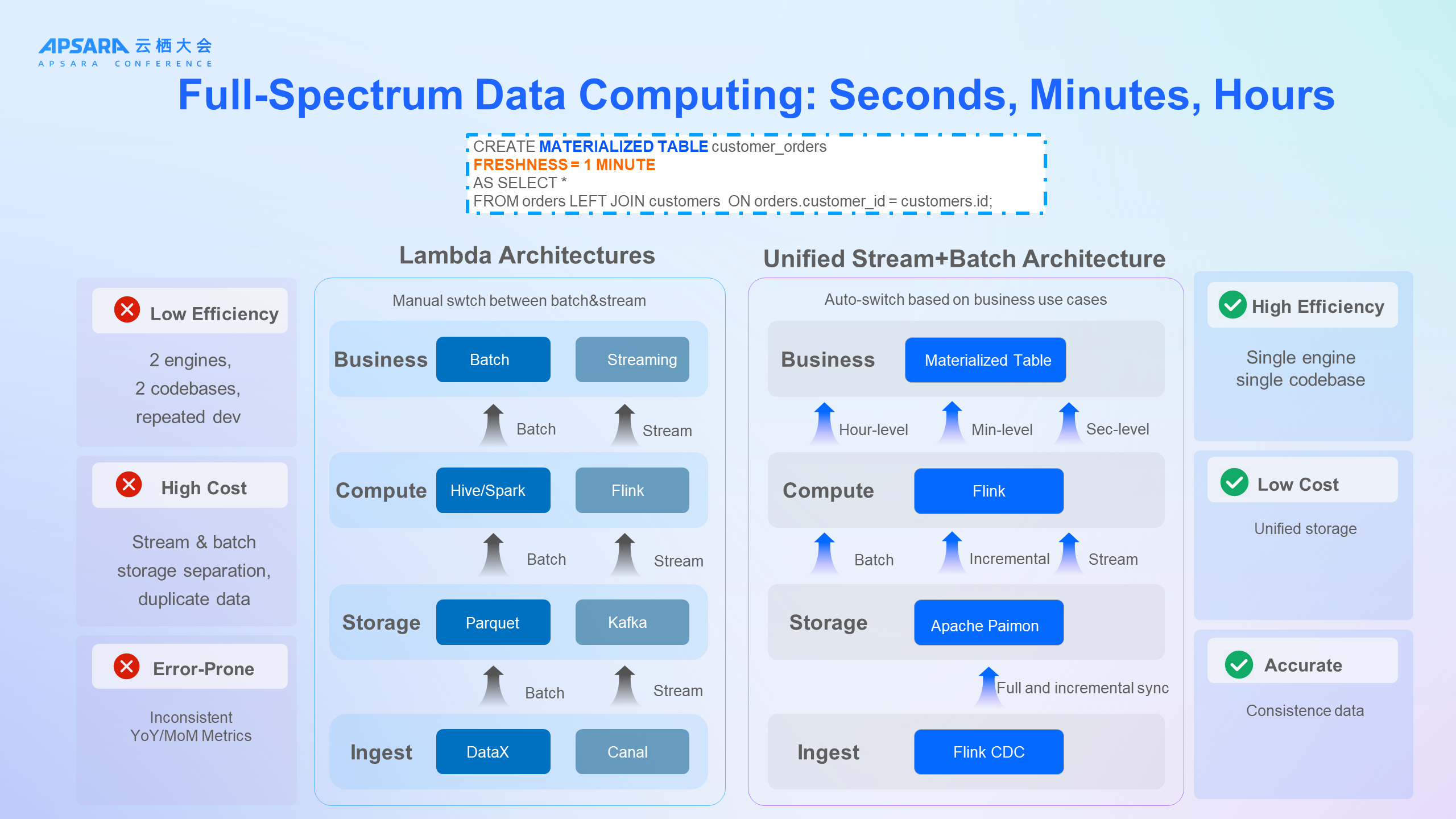 The UniFlow unified architecture replaces the Lambda model’s split batch/stream paradigm. With Materialized Tables and declarative syntax, developers can adjust Freshness to derive data at varying timeliness — all atop Apache Paimon lake storage and Flink CDC ingestion.