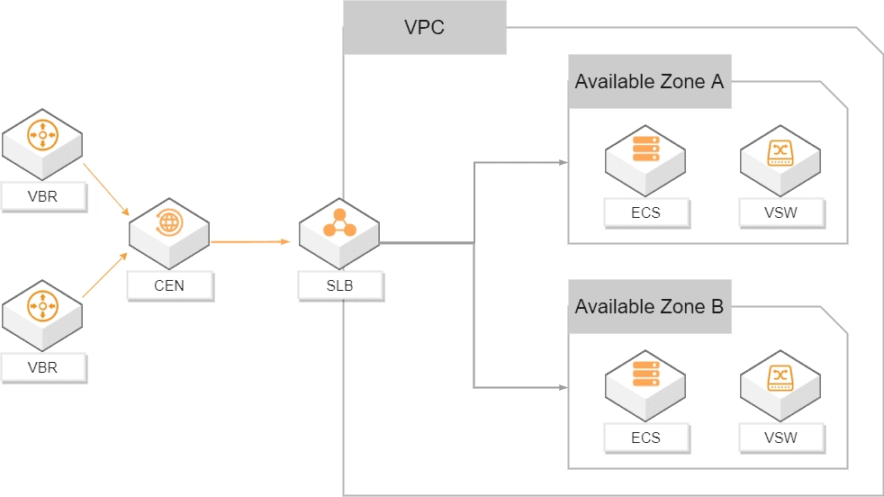 This template can be used with the template for building services across multiple zones in a region to build a multi-region, multi-zone hybrid cloud. It is ideal for users who have on-premises data centers and need to build a multi-region, multi-zone hybrid cloud with highly stable business architecture. Physical connection is the most efficient and stable method to connect an on-premises data center to a VPC.