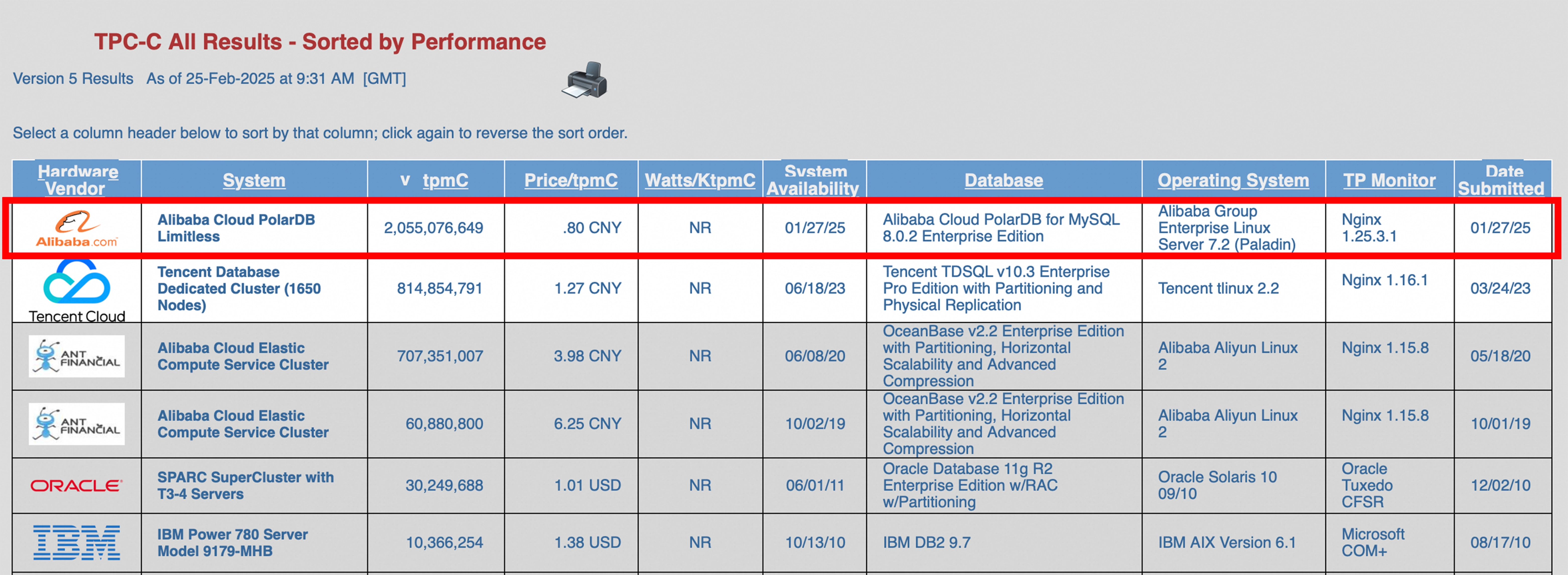 Hangzhou, China, February 26, 2025 – Alibaba Cloud, the digital technology and intelligence backbone of Alibaba Group, has set a new world record with its cloud-native relational database PolarDB in the TPC-C benchmark. Developed by the Transaction Processing Performance Council (TPC), the TPC-C benchmark evaluates the performance of Online Transaction Processing (OLTP) systems.