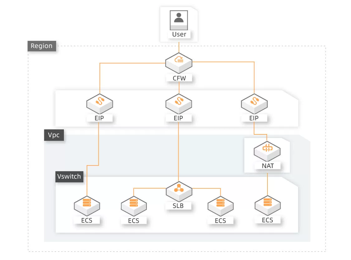 Cloud Firewall allows you to centrally manage and analyze assets exposed to the Internet (such as EIPs, public IP addresses of ECS instances, SLB instances, and ENIs). Cloud Firewall also supports fine-grained access control and Internet risk defense, helping reduce the network attack surface.