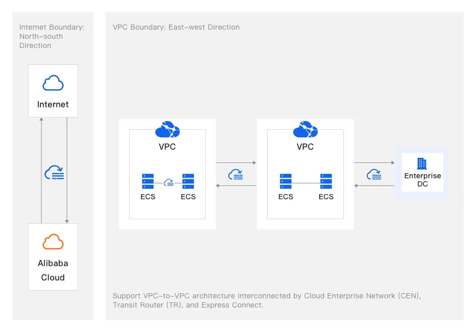 VPC firewalls help detect and control the traffic between VPCs and the traffic between VPCs and data centers. This way, you can implement fine-grained control over the traffic between VPCs, the traffic between VPCs and data centers, and the protection against internal lateral movement attacks.