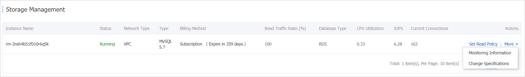 - Go to the Basic Information page of a database, and then click Storage Management in the left-side navigation pane. On the Storage Management page, you can perform regular O&M operations for dedicated ApsaraDB for RDS (RDS) instances, such as upgrading or downgrading specifications, adding or releasing read-only instances, and setting read policy.