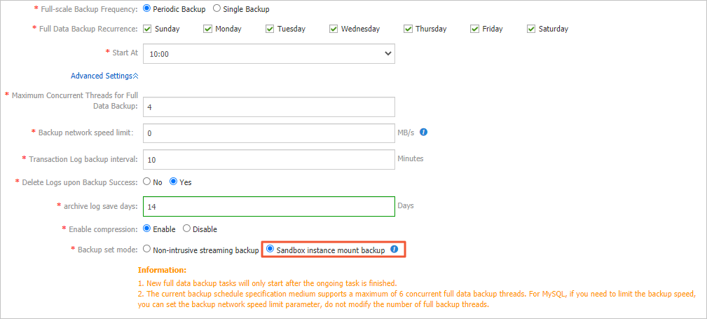 You can switch between the two backup set modes that are supported by Data Disaster Recovery. After you switch the backup set mode, Data Disaster Recovery creates a full backup task and an incremental backup task, and a gap occurs in the time range available to restore backup sets. We recommend that you do not change the backup set mode frequently.