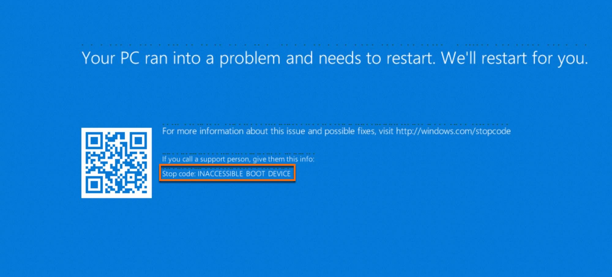After you change the instance type of a Windows instance across generations in the Alibaba Cloud Elastic Compute Service (ECS) console, the instance may fail to start. This failure is indicated by a blue screen error with the message "INACCESSIBLE_BOOT_DEVICE", which prevents you from accessing the operating system. This topic describes how to resolve this issue.