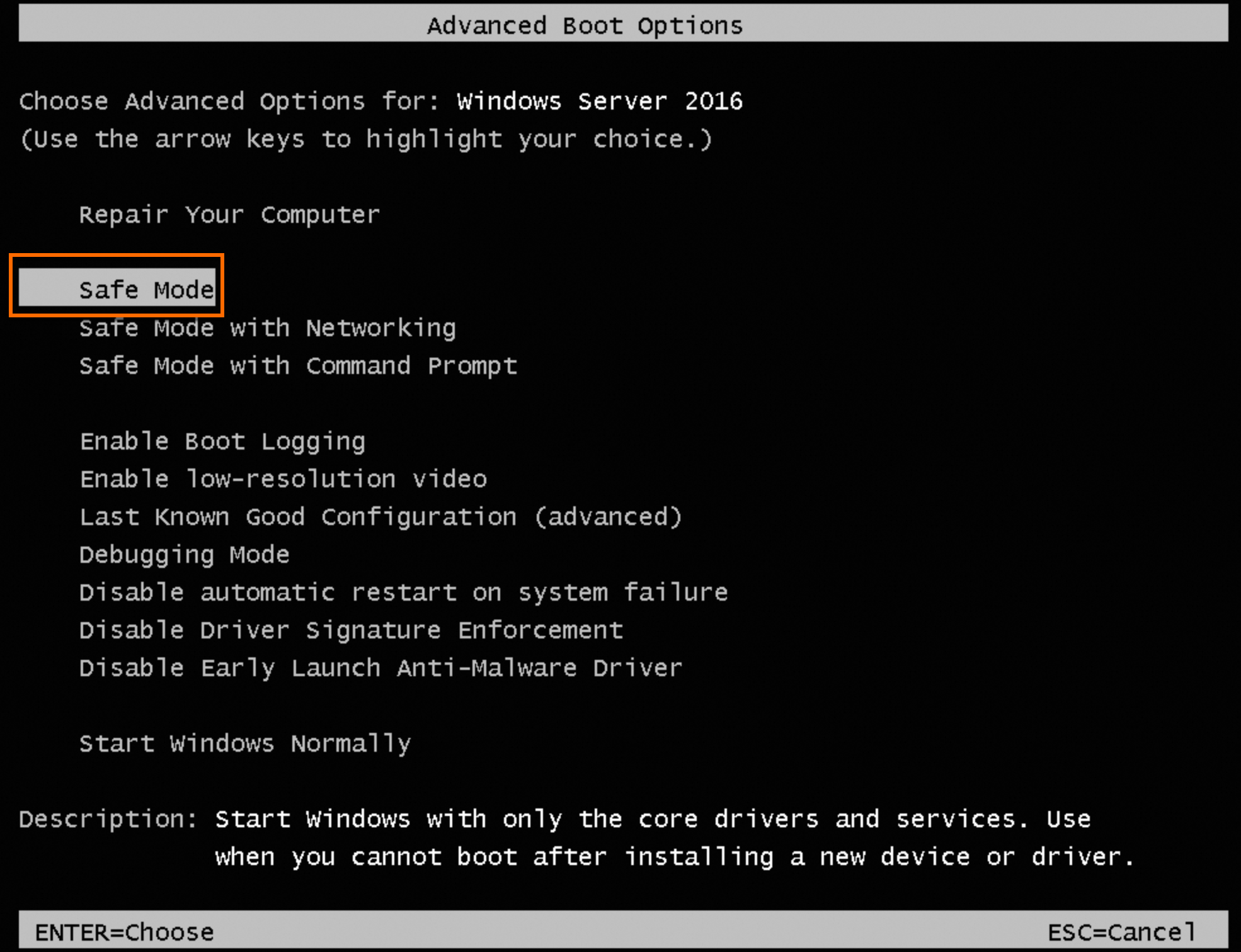 After the instance restarts, it enters the Advanced Boot Options menu. Select Safe Mode With Networking and press