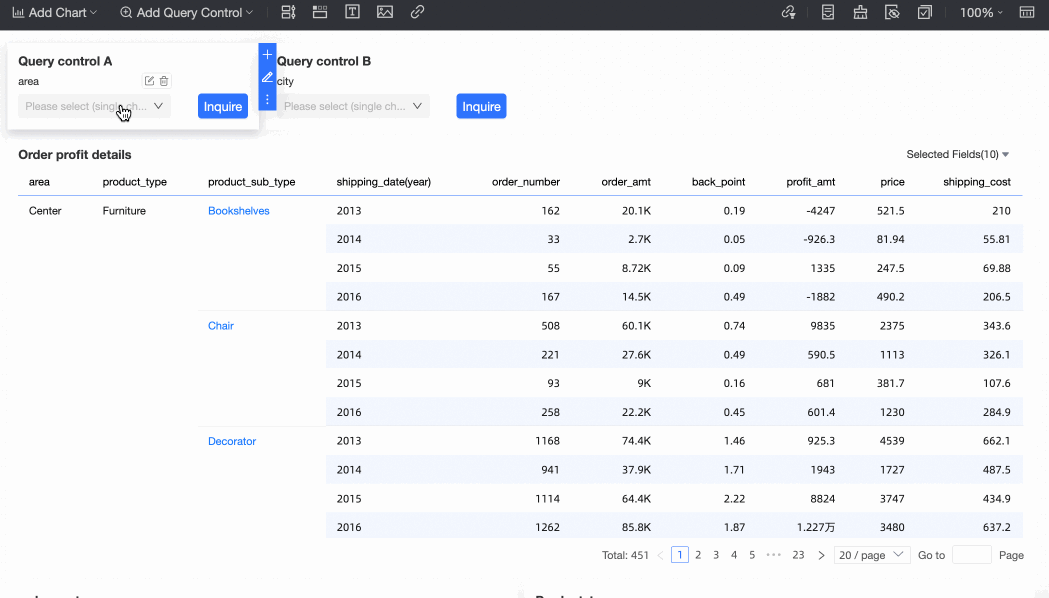 Suppose in the dashboard, Query Control A contains fields for area and province, and Query Control B contains fields for city and product category. If Query Control A and B's data comes from the same dataset, you can link the area field in Control A with the city field in Control B. When an area is selected in Control A, only cities within that area will be displayed in Control B.