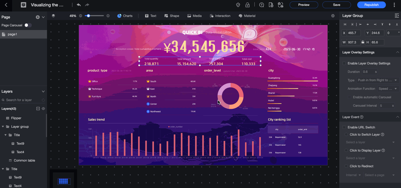 Compared with dashboards, the data dashboard uses a more flexible way to adjust the canvas. You can drag and drop components on the canvas, move them pixel-by-pixel, cut, copy, lock, hide, and combine components, and control the layout of the canvas.