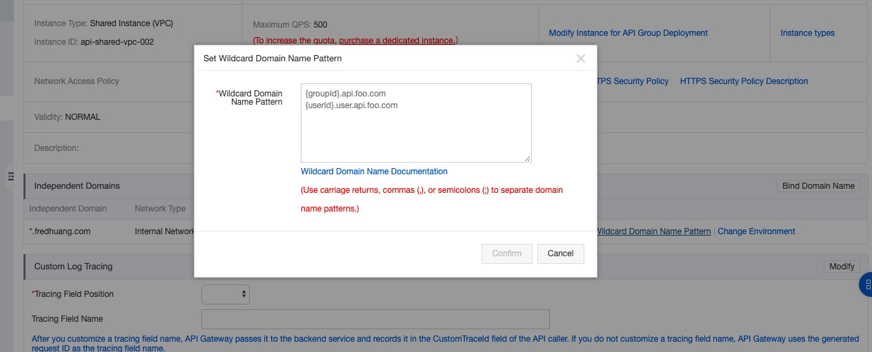 Setelah nama domain wildcard diikat, Anda harus mengonfigurasi template nama domain wildcard di halaman Detail Grup. Lalu, Anda dapat menggunakan nama domain wildcard untuk memanggil API.