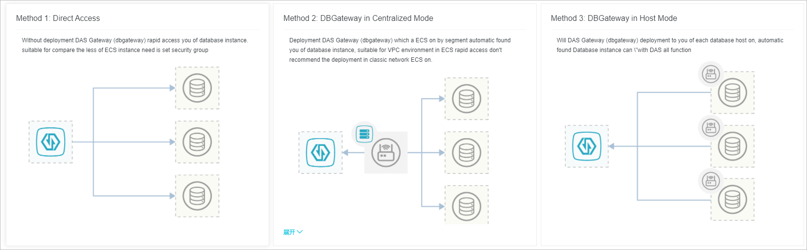 Mode host: Terapkan DBGateway pada setiap instance ECS. DBGateway secara otomatis menemukan instans database. Mode ini mendukung semua fitur DAS, seperti analisis SQL lengkap, waktu respons SQL, dan audit keamanan. Untuk perbandingan detail fitur di berbagai jenis koneksi, lihat Perbandingan fitur di berbagai jenis koneksi.