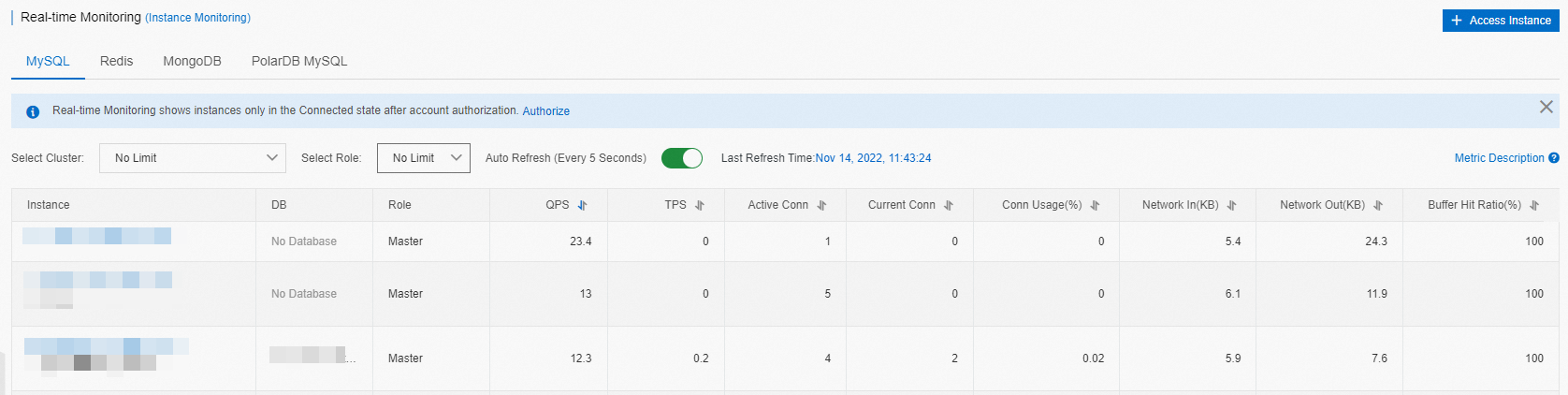 Pada halaman Pemantauan Real-time, pilih tipe database yang ingin dipantau. Di tab yang sesuai, Anda dapat melihat metrik kinerja setiap instance database secara real-time.