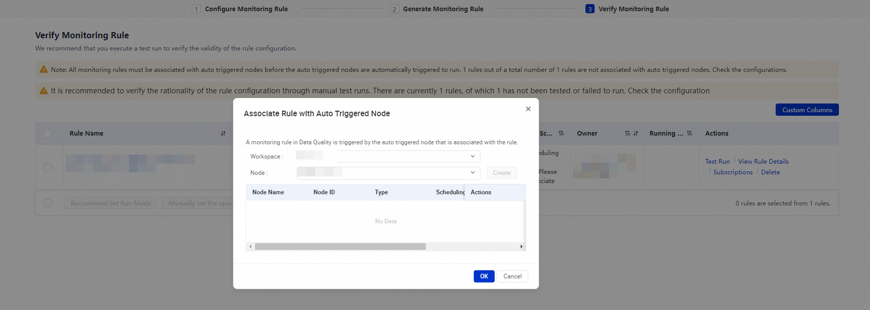 PentingJika tabel yang kualitas datanya ingin Anda periksa bukan tabel MaxCompute dan Triggered By Node Scheduling In Production Environment dipilih untuk Trigger Method, Anda tidak dapat mengaitkan node penjadwalan yang dijalankan pada grup resource shared untuk penjadwalan dengan monitor tersebut. Jika tidak, kesalahan mungkin terjadi saat monitor dijalankan.