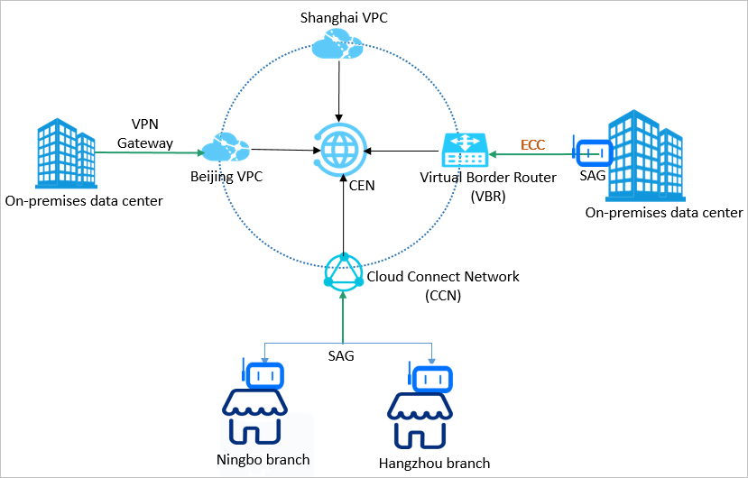CEN | CEN memungkinkan Anda membangun hybrid cloud dan jaringan global di mana sistem bisnis terdistribusi dapat diterapkan. Anda dapat menghubungkan jaringan yang berbeda dengan menambahkan jaringan ke instance CEN. Untuk informasi lebih lanjut, lihat Tutorial CEN. |