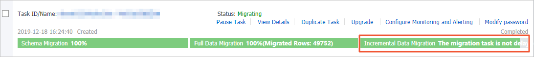 Tunggu hingga bilah kemajuan tugas menunjukkan Incremental Data Migration dan The migration task is not delayed, atau waktu tunda kurang dari 5 detik.