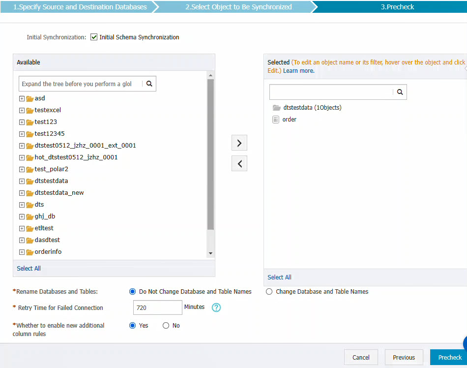 Setelah DTS menyinkronkan data ke proyek DataHub tujuan, DTS menambahkan kolom tambahan ke topik tujuan. Jika nama kolom tambahan sama dengan nama kolom yang sudah ada di topik tujuan, sinkronisasi data gagal. Pilih Yes atau No untuk menentukan whether to enable new additional column rules.