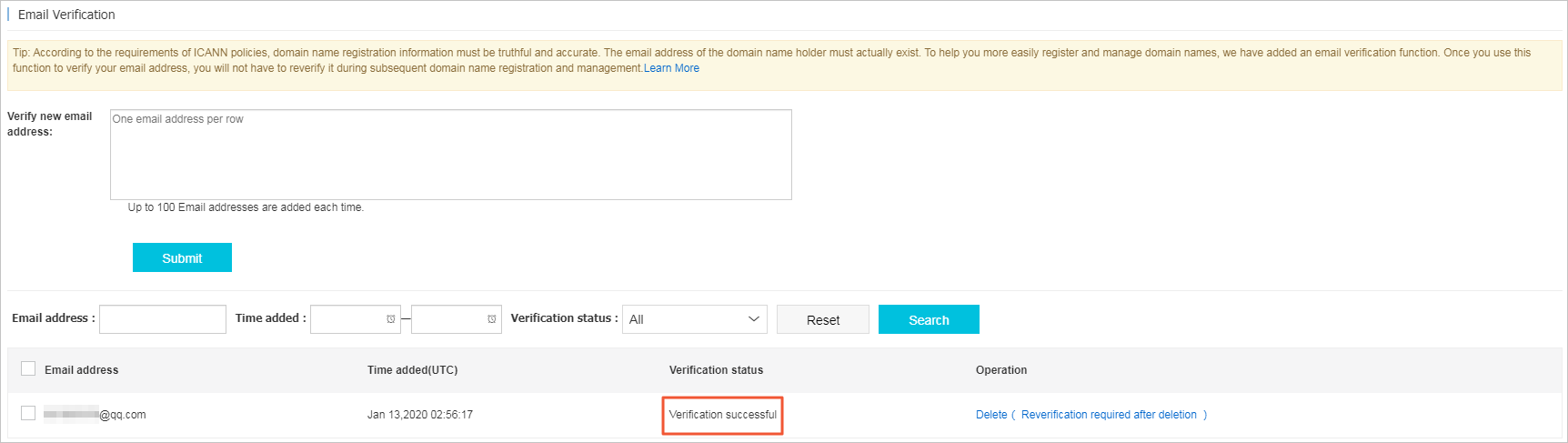 Jika Anda menghapus alamat email yang telah diverifikasi, alamat tersebut harus diverifikasi ulang sebelum dapat digunakan untuk pendaftaran nama domain baru.