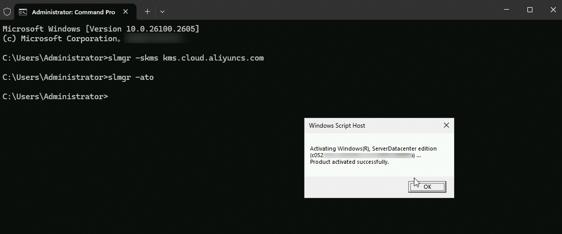 slmgr -skms kms.cloud.aliyuncs.comPentingJika perintah gagal, pastikan Anda menggunakan server DNS milik Alibaba. Menggunakan DNS non-Alibaba dapat mencegah