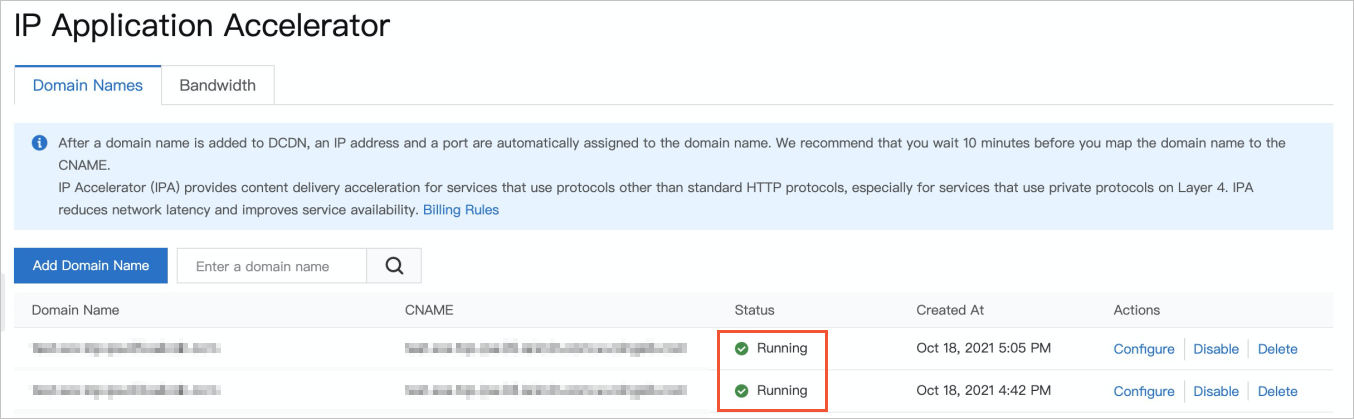 IPA terpisah dari DCDN. Anda tidak dapat menambahkan domain name ke DCDN dan IPA secara bersamaan. Jika Anda telah menambahkan domain name ke DCDN dan ingin menggunakan IPA, Anda perlu menghapus domain name dari halaman Domain Names di konsol DCDN, lalu ikuti langkah-langkah berikut untuk menambahkan domain name ke IPA.