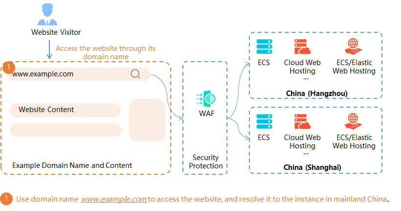 Website di-host pada instans Alibaba Cloud yang berlokasi di daratan Tiongkok. Oleh karena itu, Anda harus mengajukan pendaftaran ICP untuk Nama domain www.example.com. Setelah Nomor ICP diterbitkan untuk Nama domain tersebut, Anda harus memilih Nama domain ini saat mengonfigurasi perlindungan keamanan menggunakan WAF.
