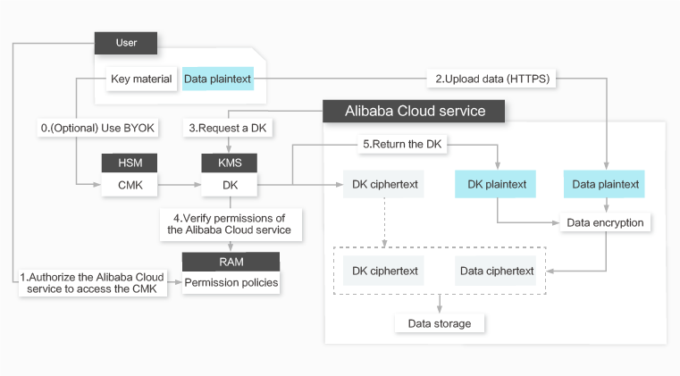 Desain enkripsi bervariasi tergantung pada layanan Alibaba Cloud, sesuai dengan bentuk bisnis dan kebutuhan pelanggan mereka. Secara umum, hierarki kunci yang terdiri dari setidaknya dua lapis digunakan, dan data bisnis dienkripsi menggunakan mekanisme enkripsi amplop.