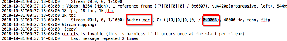 ffmpeg -re -i 0_20180525105430445.aac -acodec aac -strict -2 -f flv rtmp://xxx.oss-cn-beijing.aliyuncs.com/live/test_1000?Expires=1540458859&OSSAccessKeyId=LTAlujianb****&Signature=qwh31xQsanmao6ygCFJgo****%3D&playlistName=playlist.m3u8- Gunakan perintah asli untuk meng-ingest aliran tanpa menyetel parameter tambahan.