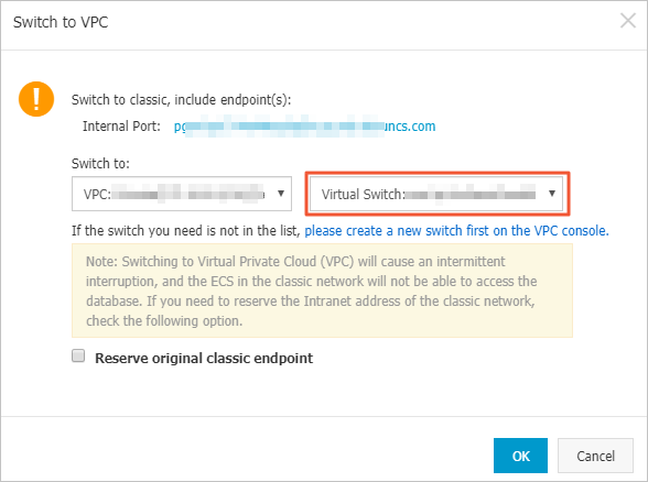 Di kotak dialog yang muncul, pilih VPC dan vSwitch serta tentukan apakah akan mempertahankan titik akhir jaringan klasik.