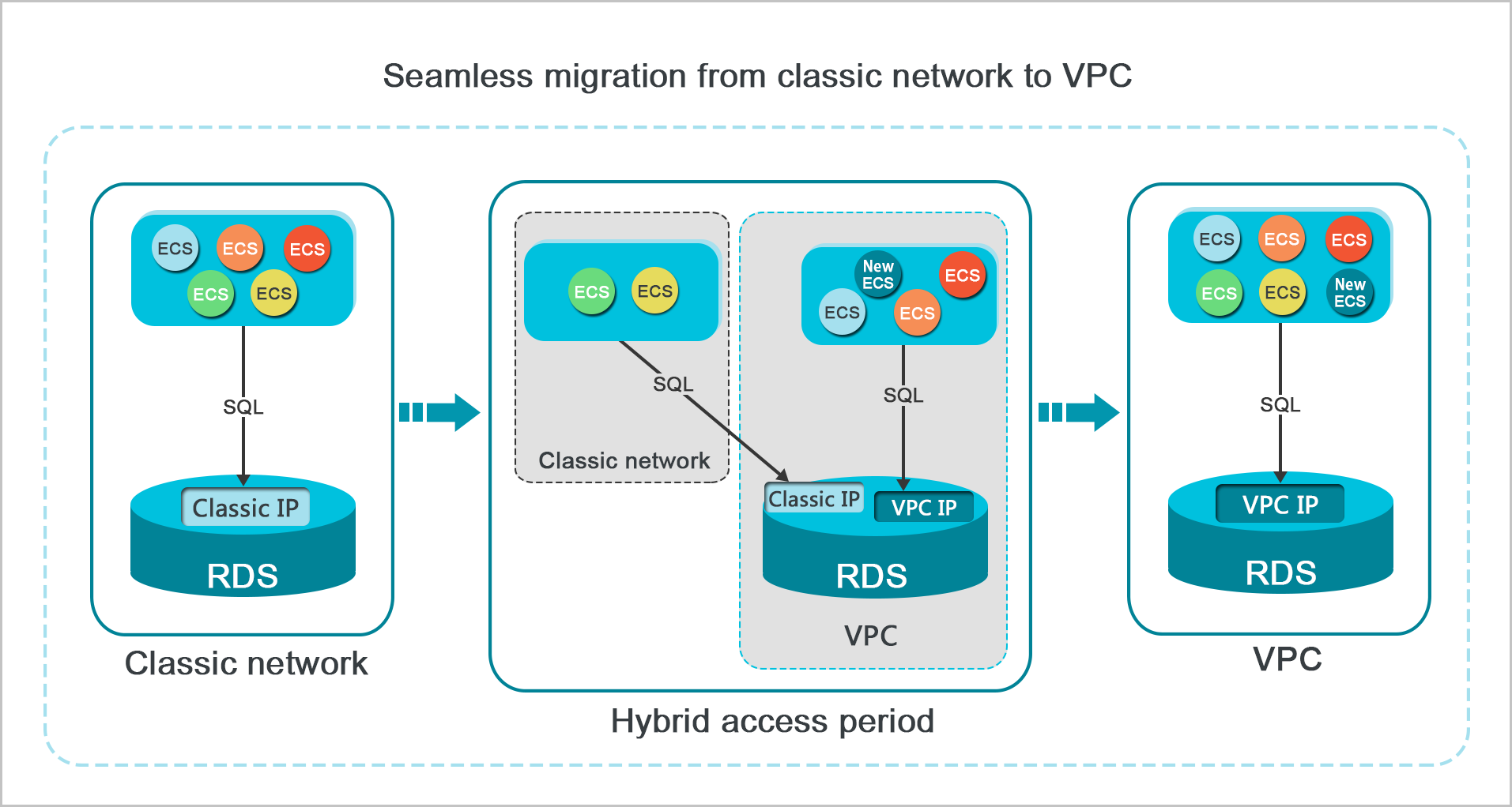 Saat memigrasikan instance RDS dari jaringan klasik ke VPC, tipe titik akhir internal berubah dari jaringan klasik menjadi VPC. Meskipun string titik akhir tetap sama, alamat IP yang terikat pada titik akhir berubah. Perubahan ini menyebabkan pergantian instance, sehingga instance Elastic Compute Service (ECS) tipe jaringan klasik tidak lagi dapat terhubung ke instance RDS melalui jaringan internal. Untuk memfasilitasi migrasi yang lancar, ApsaraDB RDS menyediakan mode akses hybrid. Untuk informasi lebih lanjut tentang dampak pergantian instance, lihat Dampak pergantian instance.
