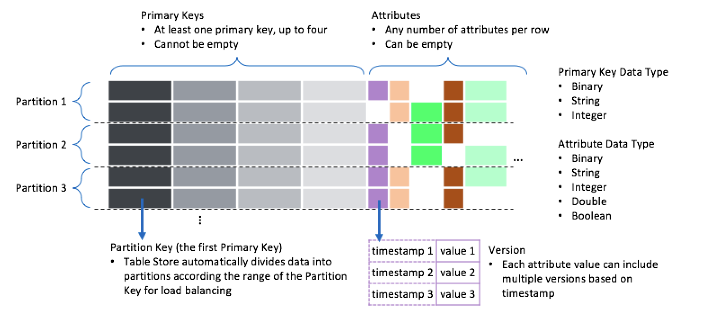 Tabel data, baris, kunci utama, dan atribut adalah komponen inti Model Kolom Lebar Tablestore. Sebuah tabel data terdiri dari baris-baris, dan setiap baris terdiri dari kunci utama dan satu atau lebih atribut. Kolom kunci utama pertama disebut kunci partisi.