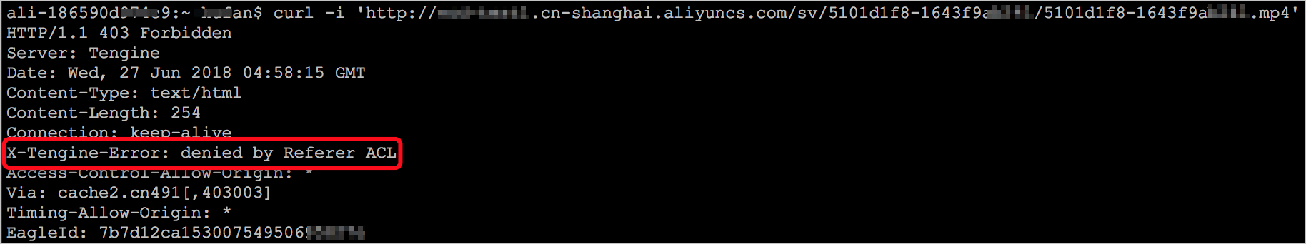 curl -i 'http://example.cn-shanghai.aliyuncs.com/sv/5101d1f8-1643f9a****/5101d1f8-1643f9a****.mp4' \ -H 'Referer: http://www.aliyundoc.com'