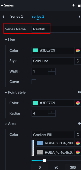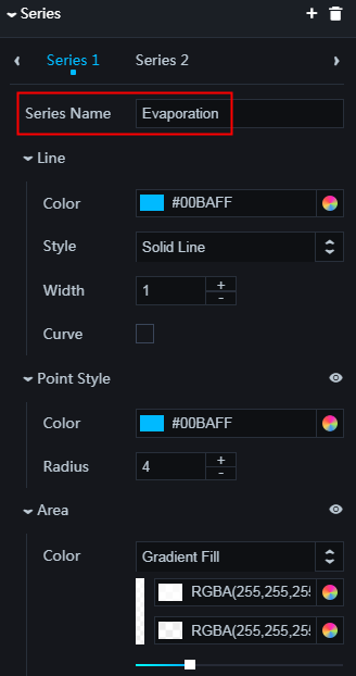 - [系列]: 系列を追加または削除するには、[+] をクリックするか、[ゴミ箱] アイコンをクリックします。説明 系列は配列です。必要に応じて 2 つ以上の系列を設定でき、エディターは系列設定を通じてデータを走査してレンダリングします。特定のフォーマットでデータを設定するには、データを手動でソートします。