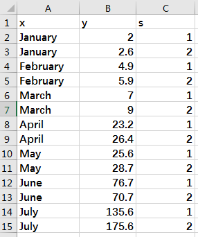 [ { "x": "January", "y": 2, "s": 1 }, { "x": "January", "y": 2.6, "s": 2 }, { "x": "February", "y": 4.9, "s": 1 }, { "x": "February", "y": 5.9, "s": 2 }, { "x": "March", "y": 7, "s": 1 }, { "x": "March", "y": 9, "s": 2 }, { "x": "April", "y": 23.2, "s": 1 }, { "x": "April", "y": 26.4, "s": 2 }, { "x": "May", "y": 25.6, "s": 1 }, { "x": "May", "y": 28.7, "s": 2 }, { "x": "June", "y": 76.7, "s": 1 }, { "x": "June", "y": 70.7, "s": 2 }, { "x": "July", "y": 135.6, "s": 1 }, { "x": "July", "y": 175.6, "s": 2 } ]
