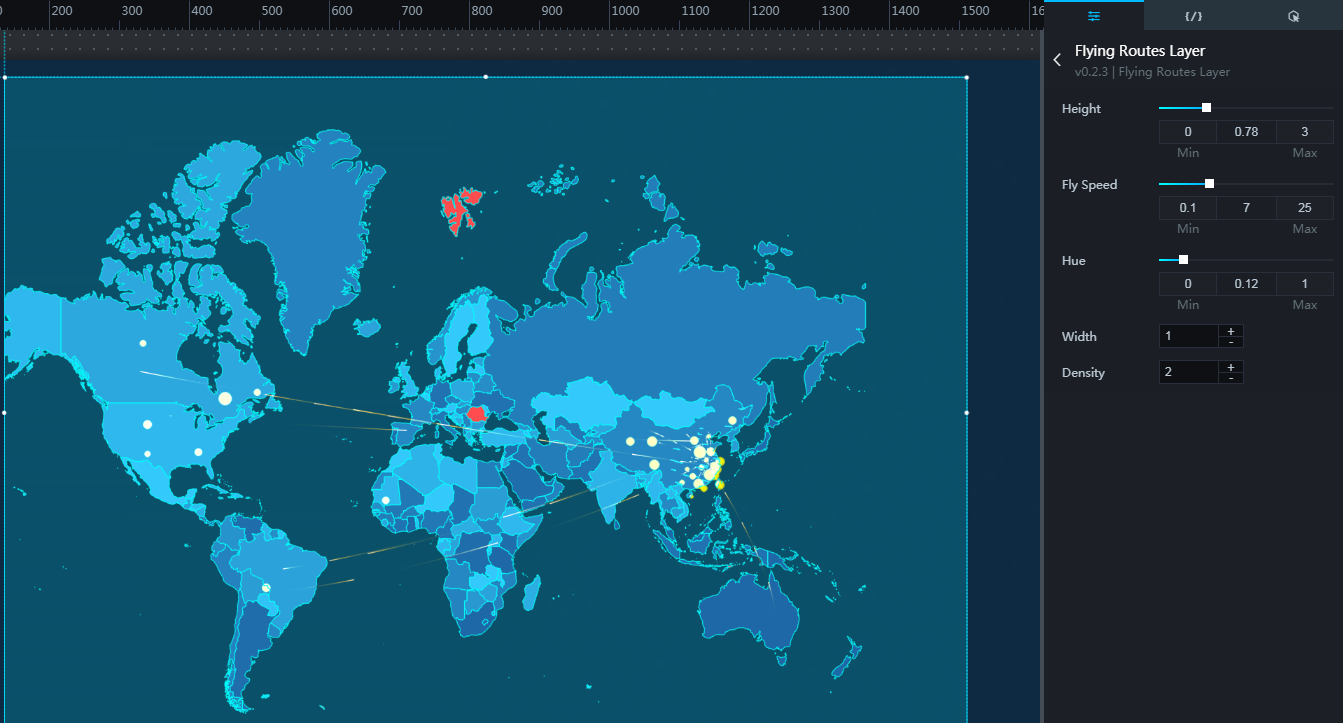 飛行ルートレイヤを使用して、地図上に飛行ルートを設定できます。 飛行ルートは、ある場所から別の場所へのトランジションアニメーションを示します。