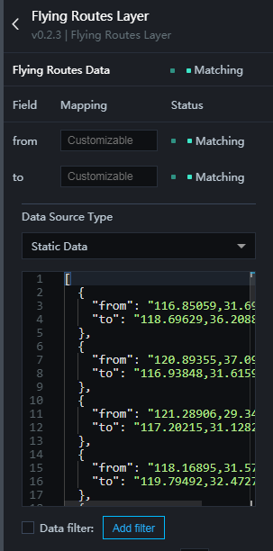 - from: フライトルート上の出発地の経度と緯度。これらはカンマ (,) で区切られます。