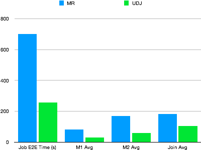 実際のオンライン MapReduce ジョブを例として使用して、UDJ のパフォーマンスを検証します。このジョブは、複雑なアルゴリズムに基づいて実行されます。この例では、2 つのテーブルが結合され、UDJ を使用して MapReduce ジョブが再書き込みされ、UDJ の結果の正当性がチェックされます。次の図は、同じデータ並行性における MapReduce と UDJ のパフォーマンスを示しています。