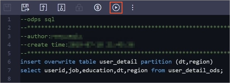 insert overwrite table user_detail partition (dt,region) select userid,job,education,dt,region from user_detail_ods;ツールバーの [実行] アイコンをクリックして、user_detail_odsテーブルのデータをuser_detailパーティションテーブルに挿入します。