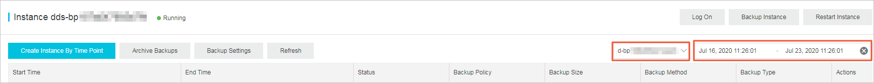 バックアップ/リカバリ ページで、次の図に示すように、シャードノードと時間範囲を選択します。