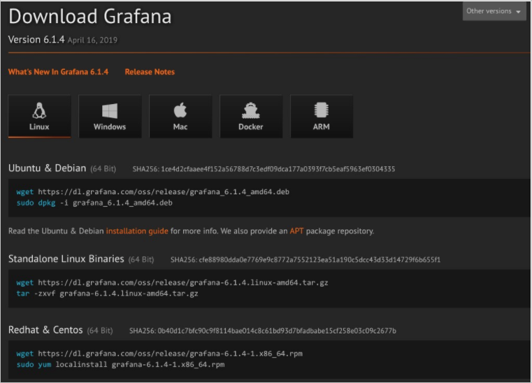 Grafana 公式 Web サイトから Grafana をダウンロードします。 この Web ページでは、さまざまな OS に Grafana をインストールする方法について説明しています。 システム OS と構成に適したインストール パッケージを入手できます。