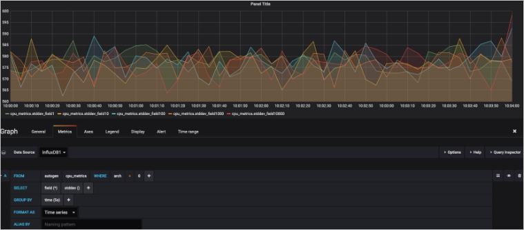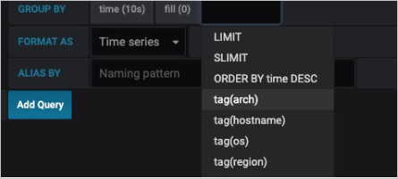 SELECT derivative(mean("field10"),10s)/10 AS "REQ/s" FROM ....GROUP BY の後のプラス アイコンをクリックして、データをグループ化する条件を指定します。 時間別またはタグ別にデータをグループ化できます。 並べ替えルールと制限も指定できます。