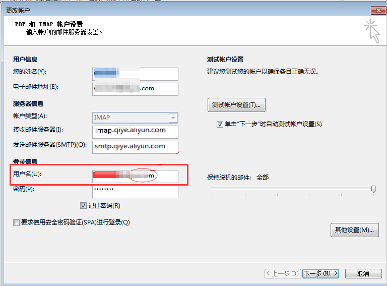 b. 如果確認已經開啟,則需要檢查用戶端配置中的使用者名稱是否只是填寫了一部分,@後的內容沒有寫,需要補全再進行重試。