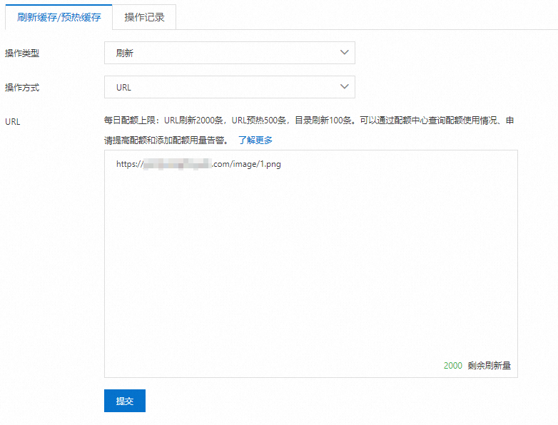 URL重新整理:強制將CDN CACHE節點上的某些檔案設定為已到期,以達到重新回源更新的目的,生效時間大約在5至10分鐘之內,同一個ID每天最多隻能重新整理2000個URL。