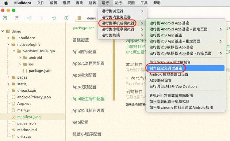 在manifest.json檔案,單擊App原生外掛程式配置。