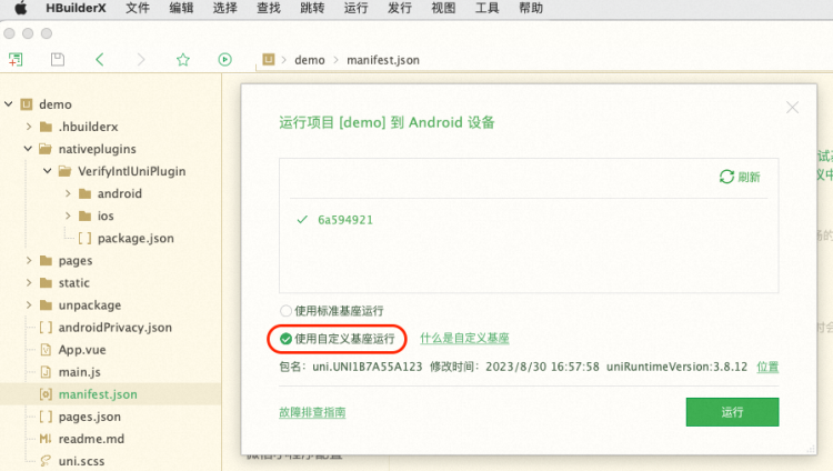 設定自訂調試基座調試運行。在manifest.json檔案,選擇,選擇使用自訂基座運行。