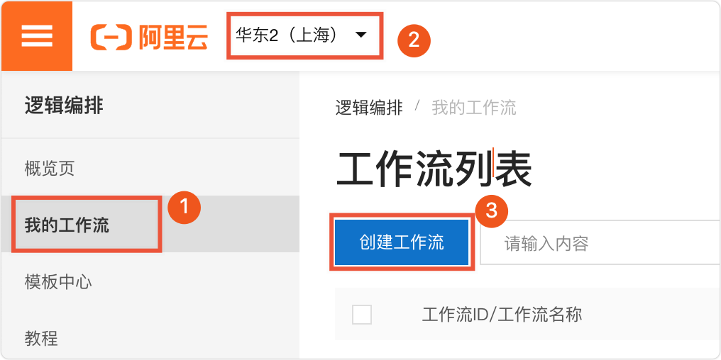 1. 進入邏輯編排控制台,進入左側菜單我的工作流程(圖示中①),在控制台上方選擇您要建立工作流程的地區(圖示中②),單擊建立工作流程(圖示中③):