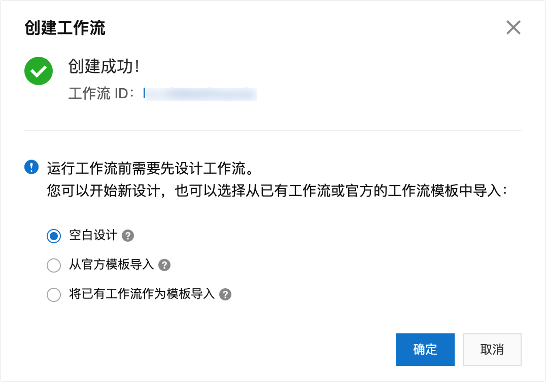 3. 在建立工作流程對話方塊中,顯示已經建立成功,單擊確定進入下一步。