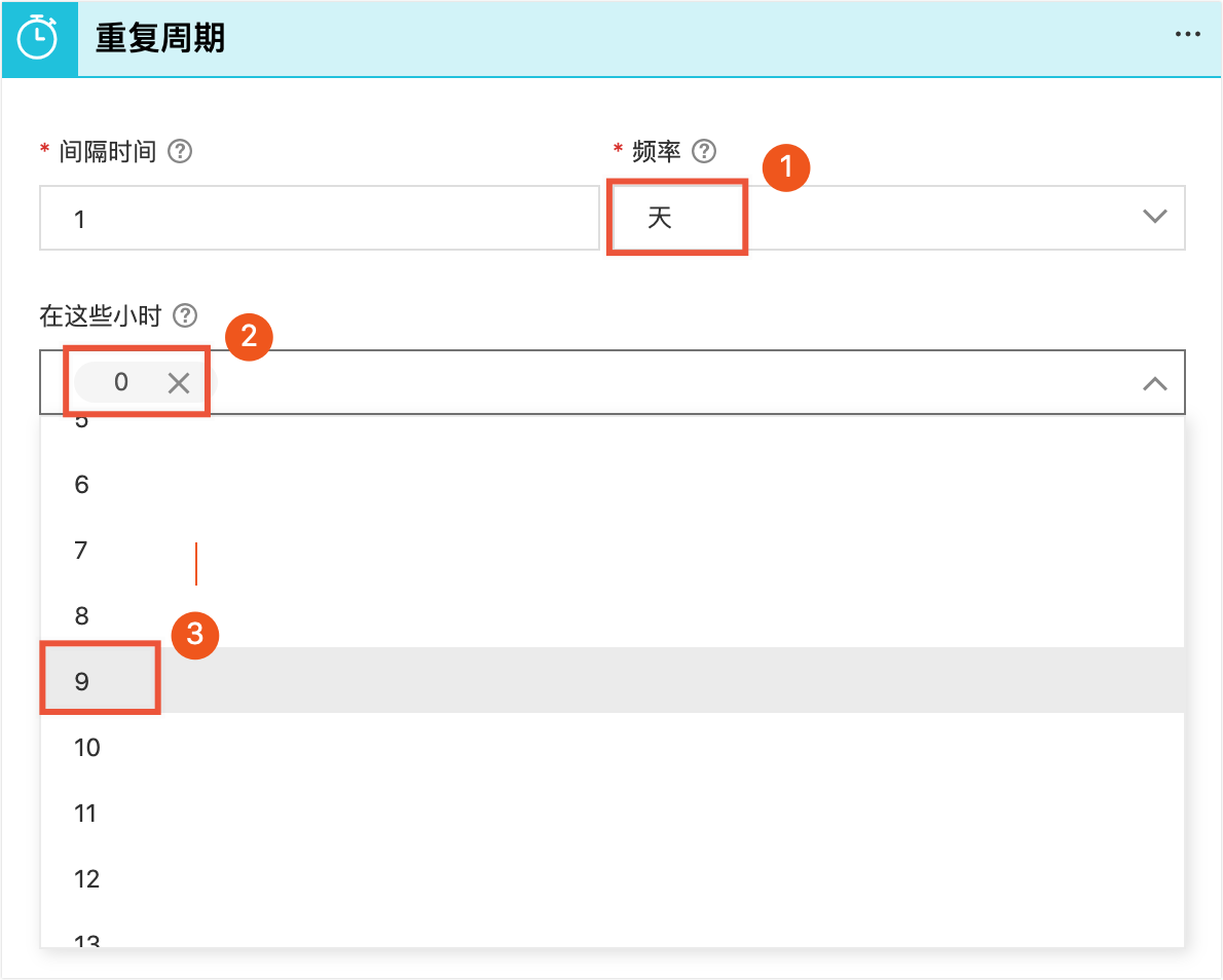 3. 我們計劃在每天早上9點進行檢查,在觸發器的配置介面中,頻率選擇天(圖示中①),在這些小時多選框內,單擊0後面的刪除按鈕(圖示中②),再在下拉式功能表中選擇9(圖示中③)。